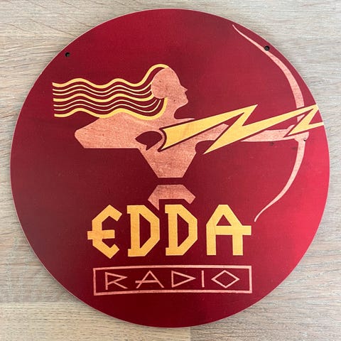 Skilt i metall med reklame for Edda Veslemøy Radio