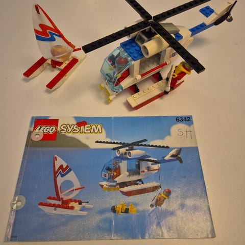 Lego 6342 Beach Rescue Chopper fra Classic Town serien fra 1993 med manual. En hvit enerbrikke mangler, er erstattet med en blå. Komplett med alle klistremerker.