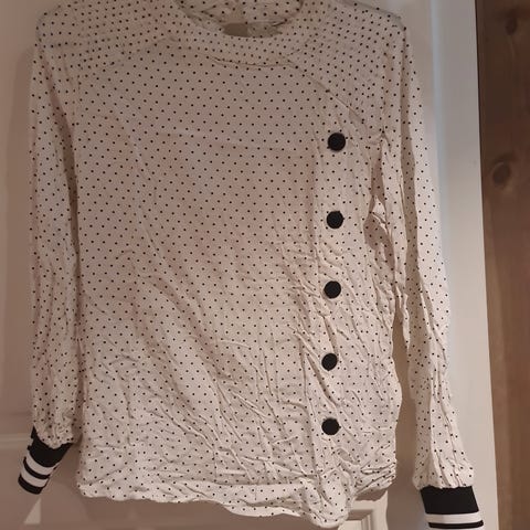 Soyaconcept. Bomullsbluse med v/-hals og fine knapper helt ned. Spesielt mønster på den øverste delen. Lett og behagelig i bruk. Har ikke vært i bruk. Hentes sentralt i Moelv —— evt sendes ved betalt porto. Se gjerne mine andre annonser.