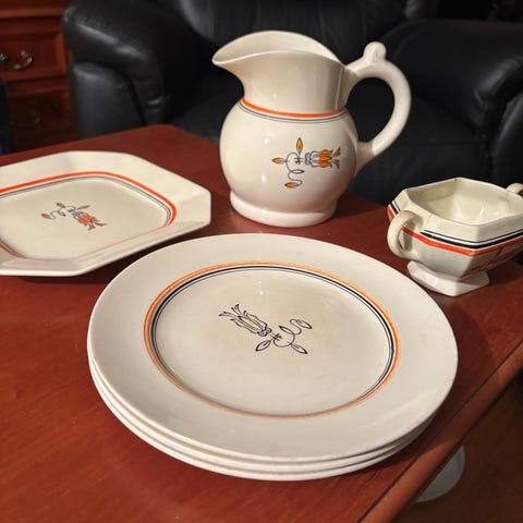 Skår på en tallerkner og bruks merker på glasuren se bildene, et skår på sukkermuggen også.