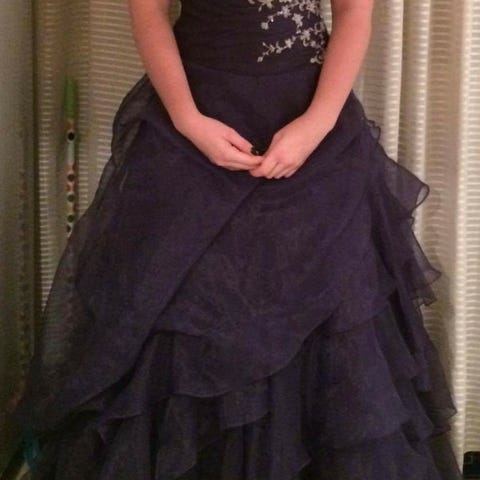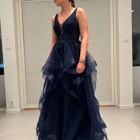 Jeg selger nydelig blå ballkjole, som ble kjøpt ny i fjor. Den er brukt en gang i kun noen timer. Datteren min målte 162 cm uten sko, så kjolen er tilpasset henne hos skredder.