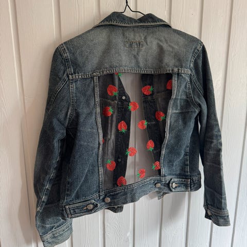 denim jacket with original cuts and a pattern on the back. handmade, one of a kind, no repeat. A universal jacket for any outfit.
