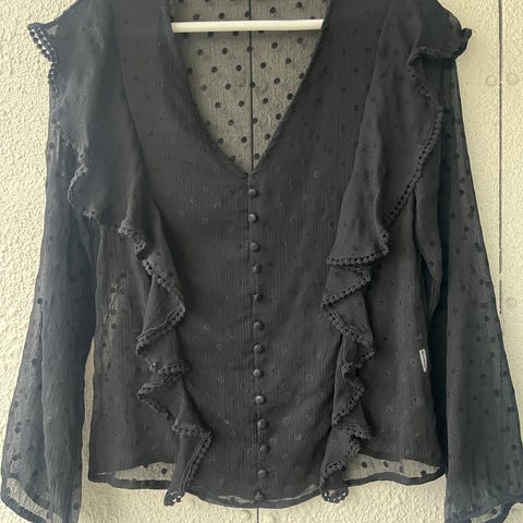 Lekker svart bluse med store blanke prikker med sølvglans selges. Blusen har rysjer langs halsen og ermene. Den har skjult lukning med små knapper. Knepningen begynner ca 15 cm fra halsringningen noe som gir blusen en liten v-ringning.