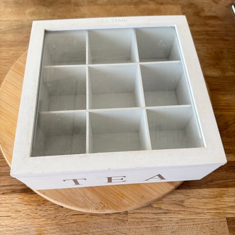 I tre. Størrelse 21 x 16 x 7 cm. 6 rom til teposer. Grønnmalt m decopage høstmotiv. Kan enkelt dekoreres om til egen stil. Brukt men i god stand. Hengsler og lås fungerer.