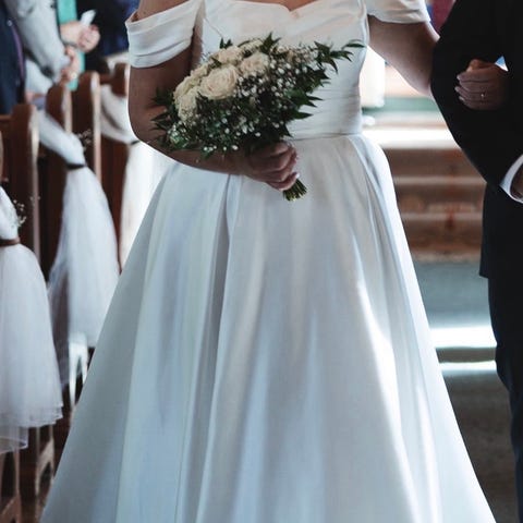Kjolen er brukt en gang, heldigvis 😉 den ble sendt på rens rett etter bryllupet. Den har ikke belte som på bildet fra designer, men har et belte som kjøper kan kjøpe, kan også kjøpe slør og underskjørt med som jeg brukte. Selger kjolen for 10000kr, men med slør, underskjørt, belte og evt ermer som jeg fikk sydd på 13000kr til sammen 😊 ermene er til å ta av med knapper, disse bør tilpasses kjøper så de sitter pent.