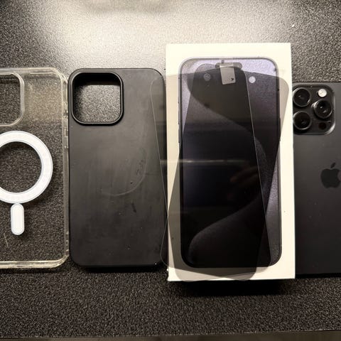 Selger min iphone 15 pro max med 256GB lagringsplass i mørkeblå titan. Kjøpt i slutten av 2023, så er kunn brukt i litt over 1,5 år. Ingen synlige bruksmerker og alt funker som det skal😊