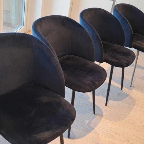 Blå fløyel med svarte stilrene bein. Populære fine stoler med svarte bein.