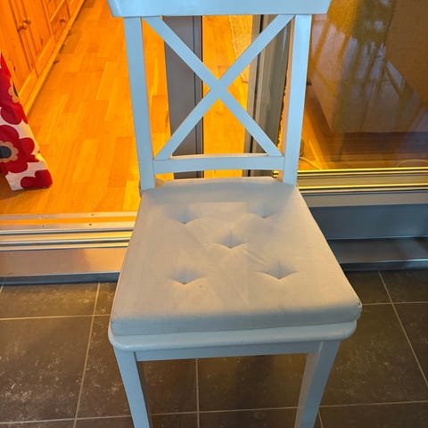Brukt til spisestue men kan fint brukes andre steder . Feks kontorstol. Sminkestol. Lett å vaske av. Og er renset allerede.