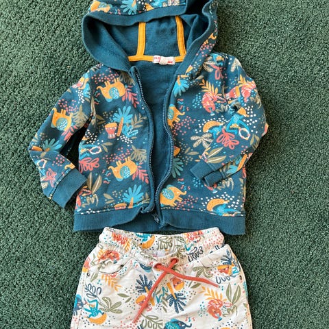 Flotte sett med franske babyklær, shorts 71 cm, t-skjorten og hettegenser 74 cm
