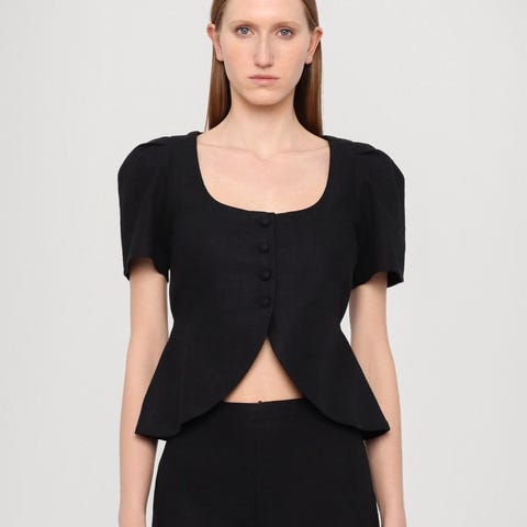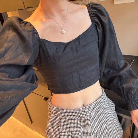 søkeord: black sort svart top topp asymmetrisk asymmetric asymmetrical 100 % lin ekte linen lintopp lintop bluse linbluse puffermer balloon sleeve