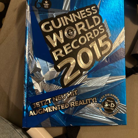 Guinness World Records 2015 Bok i blå farge. Denne jubileumsutgaven inneholder en samling av verdensrekorder fra 2015. Boken har et hardt omslag og er kjent for sine informative og underholdende innhold som dekker forskjellige kategorier av rekorder.