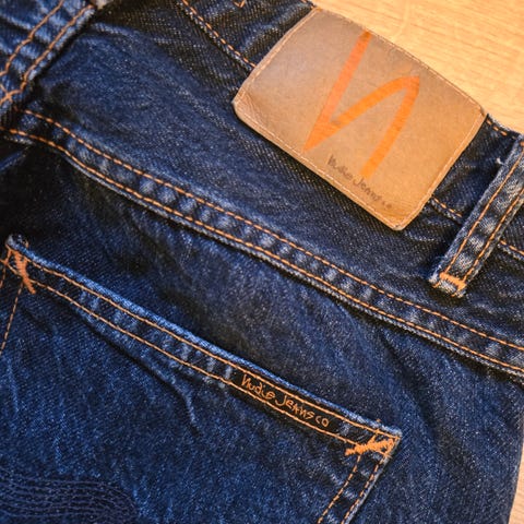 Trendy jeans med høy midje og avsmalnende ben. Buksen er laget i et behagelig bomullsmateriale uten stretch. Buksen har fem lommer, beltehemper og klassisk logopatch bak. Lukkes med knapp og skjult glidelås i front.