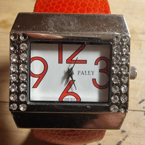 Quartz «Trend», firantet «gull» klokkehus på rød rem i lakk Regulerbar rem med spenne / hull. Bredde 3,5 cm Selve klokkehuset er kantet med «bling» på hver side. Aldri brukt men har vært lagret i noen år og vil mest sannsynlig trenge nytt batteri. Fastpris.