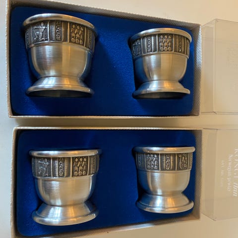Flott eske fra Askvoll Brug AS med 2 stk Brennevinsbeger i støpt tinn, fritt for bly og andre giftige metaller. Begerene er ca 5cm høye og 5cm i diameter. Gravert med Mester Grønn i fronten.