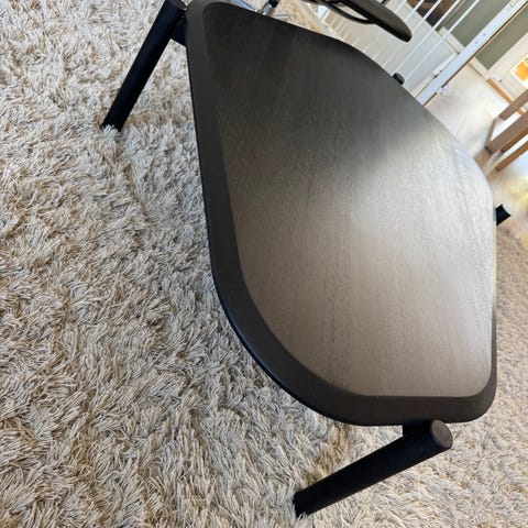 Farge er lys grå. Jeg har brukt møbelknotter for å unngå å skrape opp bordet under.
