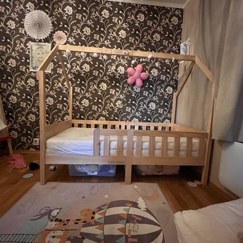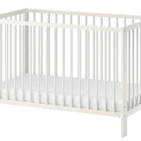 Barna seng 0 til 6 år med justerbar til to nivå 40 og 65 cm ,120 cm lang og 60 bredde med Jacadi madras og side madras ,og sengetøy toy dyne og putte fra Jacadi til jente.
