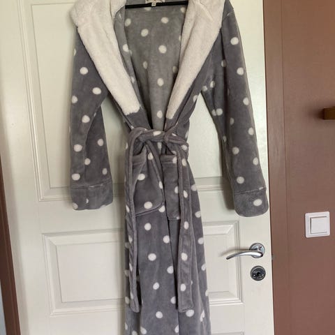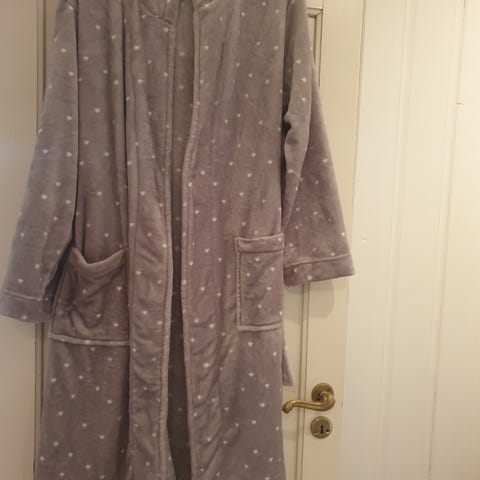 En fin morgenkåpe med hette i rosa farge med prikker/dotter.