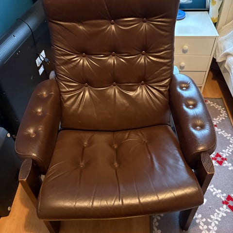 Ikonisk gyngestol av Lena Larsson for Nesto. Det er noen sår i malingen og små sprekker mellom bordene i setet. Ellers fin og god å sitte i. Følger med en rød pute. Vet ikke om den er original.