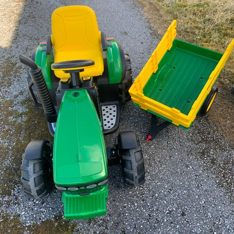 John Deere traktor med gummihjul og henger.