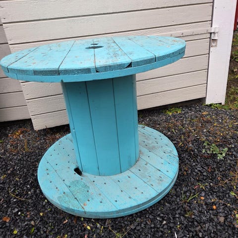 Pent brukt kabeltrommel til salgs. Denne praktiske kabeltrommelen har en høyde på 65 cm og en bredde på 80 cm, perfekt for bord til terrasse eller bar.