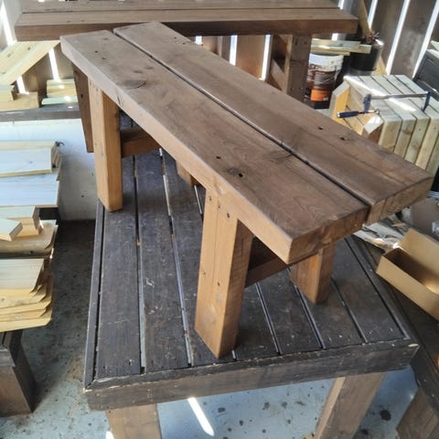 Røffe benker å krakker.