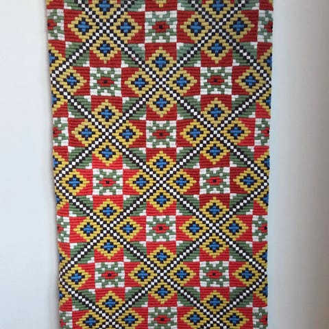 Brodert teppe i ull. Str. 145 x 55 uten frynser. Teppe lå på en kiste hos min bestemor og er minst 70 år gammelt.