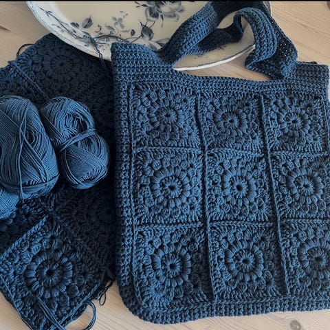 Unik buttercupbag, nystrikket. Måler 37x37