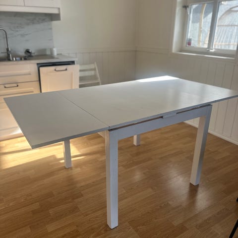 Den er 180 sm, har to illeggsplater på 50 sm, totalt kan utvides til 280 sm. Illeggsplater ligger skjult under bordet og er veldig lett å håndtere.