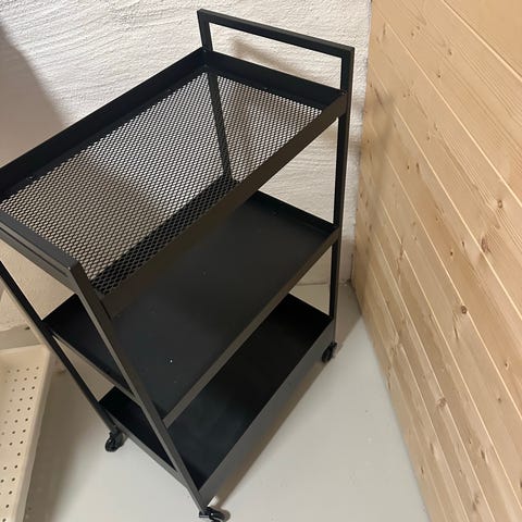 Sort metall avlastnings bord/hylle med hjul