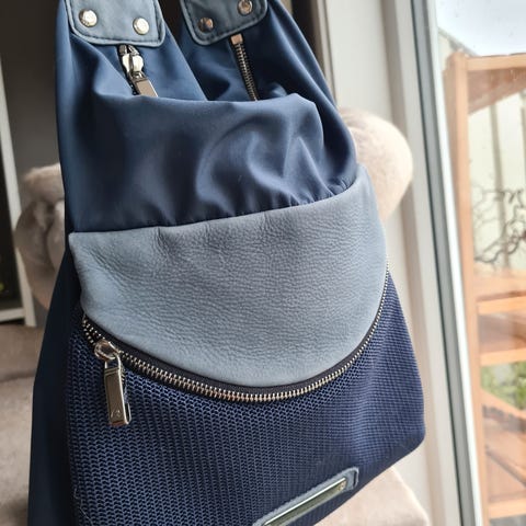 Lukkes med glidelås, og har et moderne design med sølvfarget metallplate-logo og praktiske detaljer. Noen små merker fra lagring, men ingen skader.