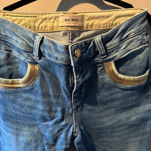 Mos Mosh denim skjørt i fargen blå, størrelse 30. Skjørtet har klassisk jeansdesign med lommer foran og bak. Passer til uformelle anledninger og kan kombineres med ulike topper for en komplett look. Kun brukt to ganger.