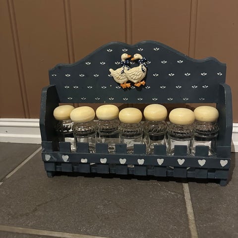Bra stand, unntatt lokket på saltboksen, den har vært limt 1 gang ser det ut til. Kan sendes. Kjøkken krydder kryddersett kjøkkensett krukke krukker pyntegjenstander krydderhylle