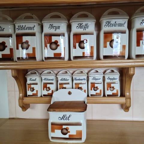 Med merket Mepoco er dette krukkesettet garantert et samlerobjekt for enhver kjøkken- og hjemmeentusiast. Krukkene er også perfekte for oppbevaring av tørre varer som mel, sukker og kaffe, og vil holde kjøkkenet organisert samtidig som de gir et vintage preg. Ikke gå glipp av sjansen til å eie dette vakre settet, perfekt for enhver samler eller elsker av antikt kjøkkenutstyr.
