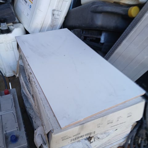 59 flotte hvite blanke avlange fliser. 11,5 x 32,6 cm. Og en del små sorte.
