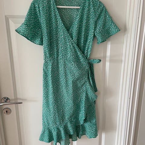Omslagskjole som knytes på venstre side, knapp i nakken.
