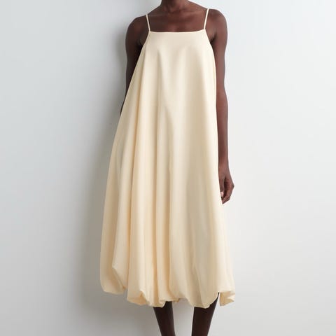Reminiscent of summer days, this dress is styled with a stretchy gathered bodice, slender straps and an open V-back with tie detailing. The skirt billows from the waist while maintaining its delicate form, and pockets are subtly slotted in the side seams.