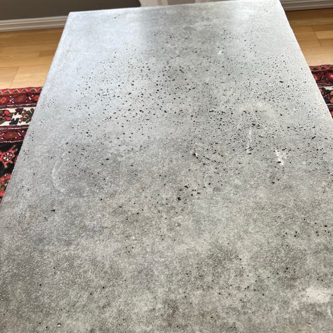 Bord til sofaen. Bordplaten er laget av stemplet betong med en glans av grått gull. Bordbena er smidd jern, vridd under bearbeiding, veldig stabile.