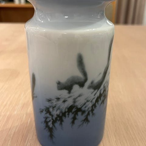 Original Porsgrund-vase fra serien Blå Fugl. Produsert ca. 1950. Elegant blågrå glasur med motiv av fugler, typisk for norsk designtradisjon. Stemplet under med "Porsgrund Porselænsfabrik". Ingen skader, pent brukt.