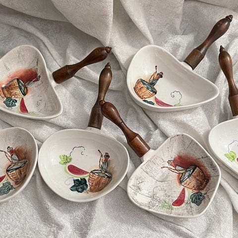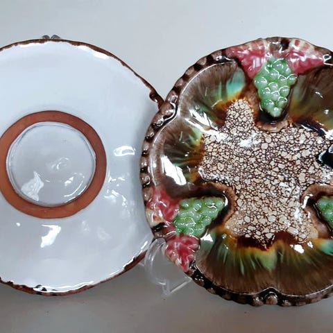 4 asjetter laget ved det lokale keramikkverkstedet Spektro i Skiptvet, antagelig produsert mellom 1950 og 1970. Dette er ekte lokal industrihistorie – håndlaget og glasert i karakteristisk fargerik stil med relieffdekor og glansglasur.