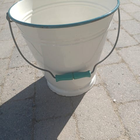 Antikk, emaljert bøtte. Et par rustflekker (på kanten og en nedi), men ellers hel og pen. Fin i fargene.