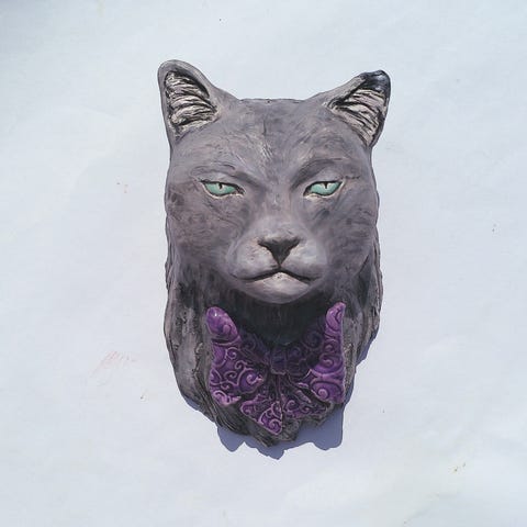 Håndlaget og signert kattebyste i keramikk, kun en av. Str. ca 20 cm. Begått av undertegnede. Håndmodellert, og glasert, to brenninger, råbrann og glasurbrann. Blank glasur på øyne og sløyfe, ellers matt. Oppheng for vegg på baksiden. Kan sendes mot et pristillegg på kr. 135,-. (kun Posten med sporing)