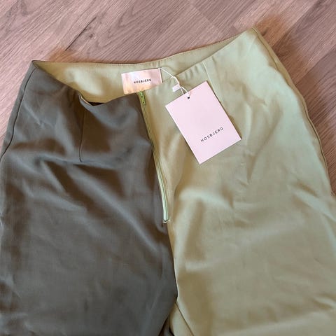 Stilige bukser i blank, litt mørk sølvfarge fra danske Hosbjerg. Litt struktur/mønster i stoffet. Skal ha en normal til slim fit passform. Kjøpte dem selv på Tise, må dessverre selge dem igjen fordi de var for store (normal i størrelsen, jeg bruker vanligvis 38/40).