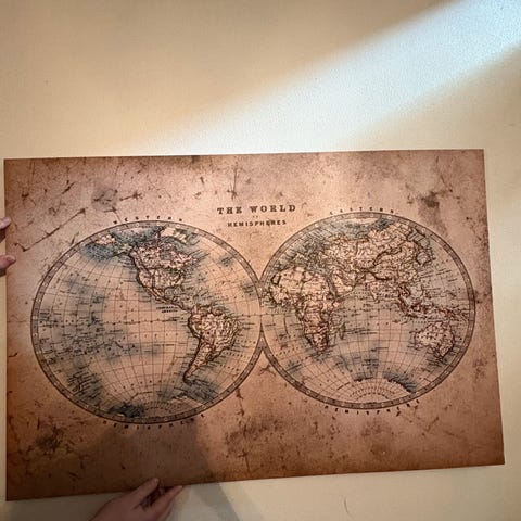 Selger et kart av verden 70cm x 50cm x 1,5 cm.