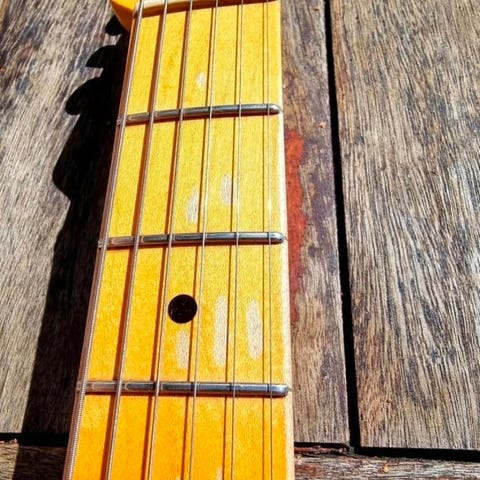 Har hatt inne til oppsett, slip og jevning av bånd, så mykje betre oppsett og spelbarhet enn når eg fekk den i posten. Mykje gitar for pengane! Følger med fender gigbag.