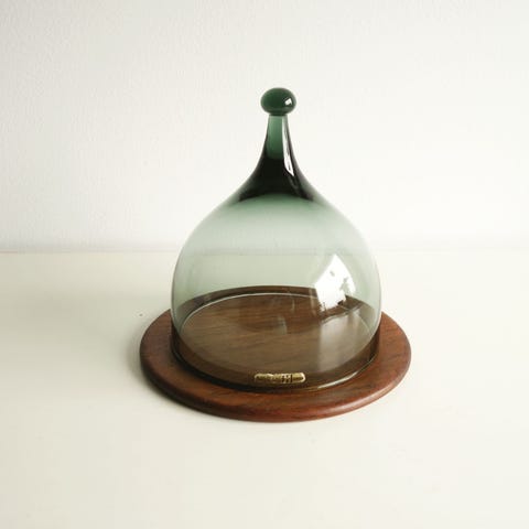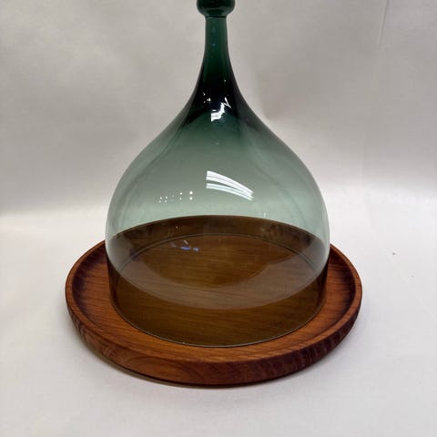 Osteklokke H: 21/22 cm D: 17 cm nederst på klokken D: teakfat 20,5 cm. I fin stand, ingen skår/skader. Benny Motzfeldt for Hadeland Glassverk Scandinavia Mid -century, Norway. Kr. 1750,-