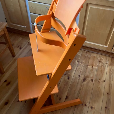 Selger en mørke brun Tripp Trapp stol med rygg, bøyle, bord og puter. Stolen har bruksmerker (se bilder). Selges samlet og må hentes hos selger.