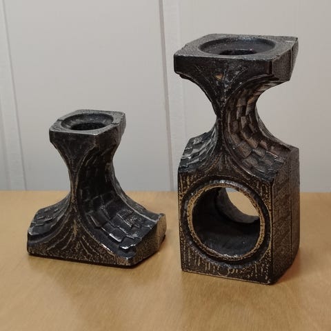 Lysestakene viser tegn på bruk, som små sprekker og misfarging, men det gir dem et autentisk vintage preg. En av lysestakene har en liten blå merke på toppen, som kan være patina eller en mindre feil, men det påvirker ikke funksjonaliteten.