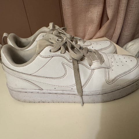 Nike Dunk Low sneakers / basketsko I str 40, innersåle er 25,5 cm lang. Hvit og beige. Veldig fine. Men de er relativt godt brukt i en kort periode på 3-4 mnd. Dvs at de har litt bruksmerker utenpå. Ingen slitasje inni. Jeg har prøvd å vaske dem utvendig, men de bærer fortsatt preg av bruk.