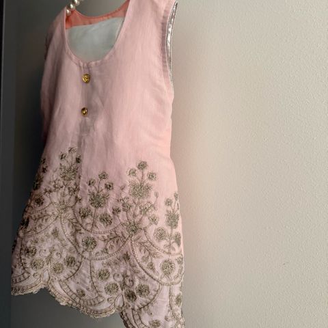 Beautiful thread and stones work on a frock. 1-2year old girl. NOT one size. Comes with matching purse, sjal (dupatta) and trousers. Blue-green color. Pakistani/indian style.