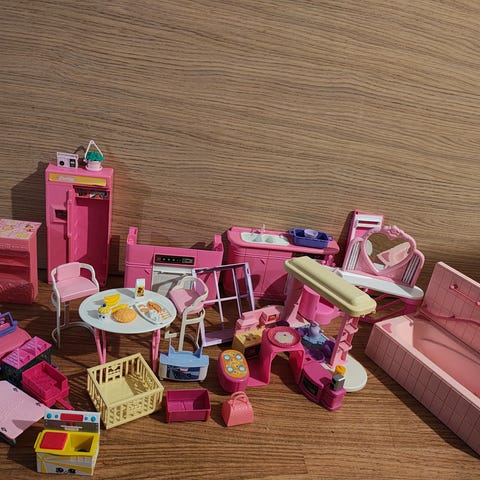 Huset er i ganske fin stand. Et par av klistremerkene er tatt vekk og et par begynner løsne. Det følger med et barbie barn.